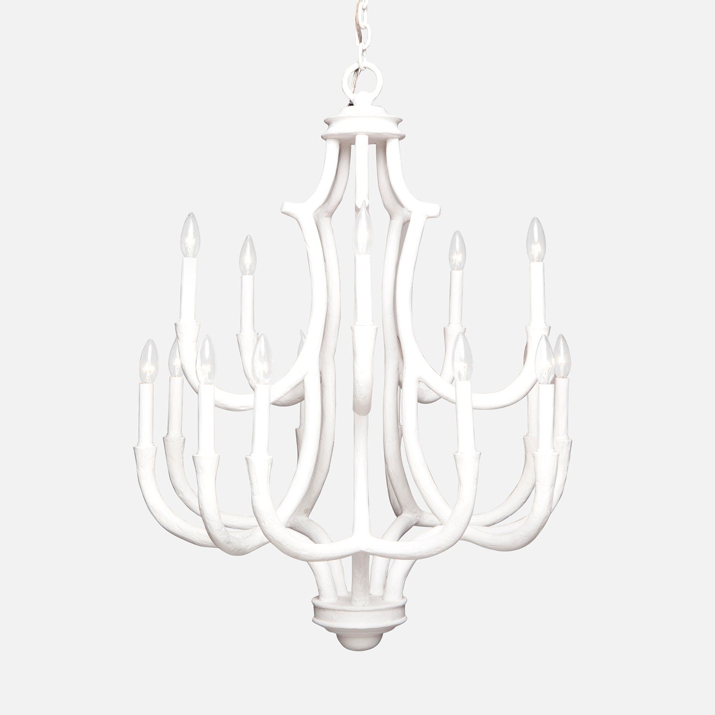 - The gesso finish of this tiered chandelier takes a classic shape and makes it modern.