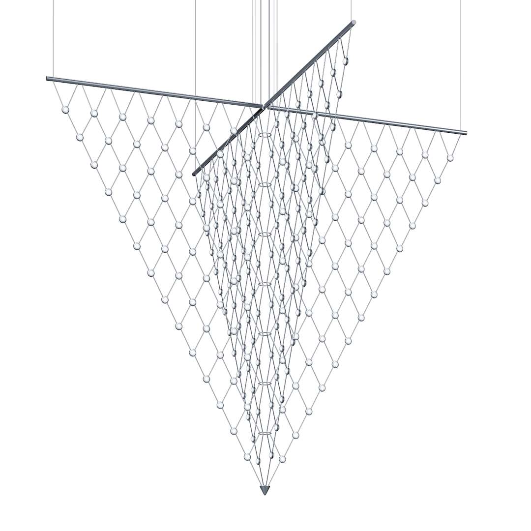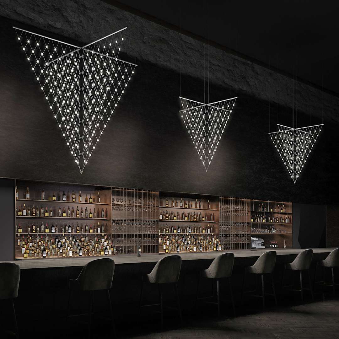 The dazzling luminance of double-sided lensed LED hubs are captured in a mesh-like weave. These expansive triangular or rectilinear arrays can be suspended vertically or captured within rectilinear tubular frames to span space horizontally across a plane. The points of light radiate illumination through the option of faceted crystal or soft white lenses. Galaxy Matrix can also be customized for your project.