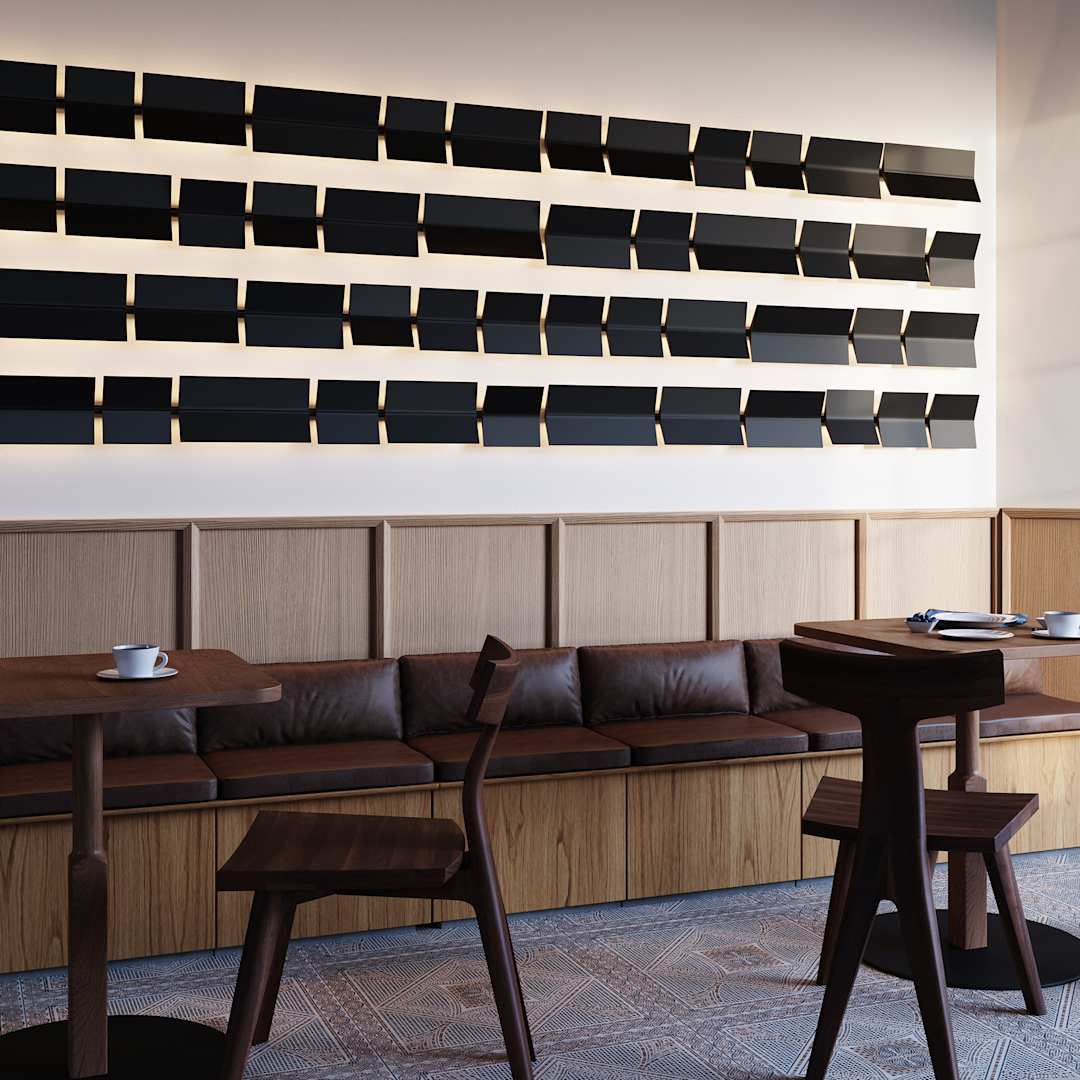 - Creates sculptural vertical surface compositional unity with light and shadow.