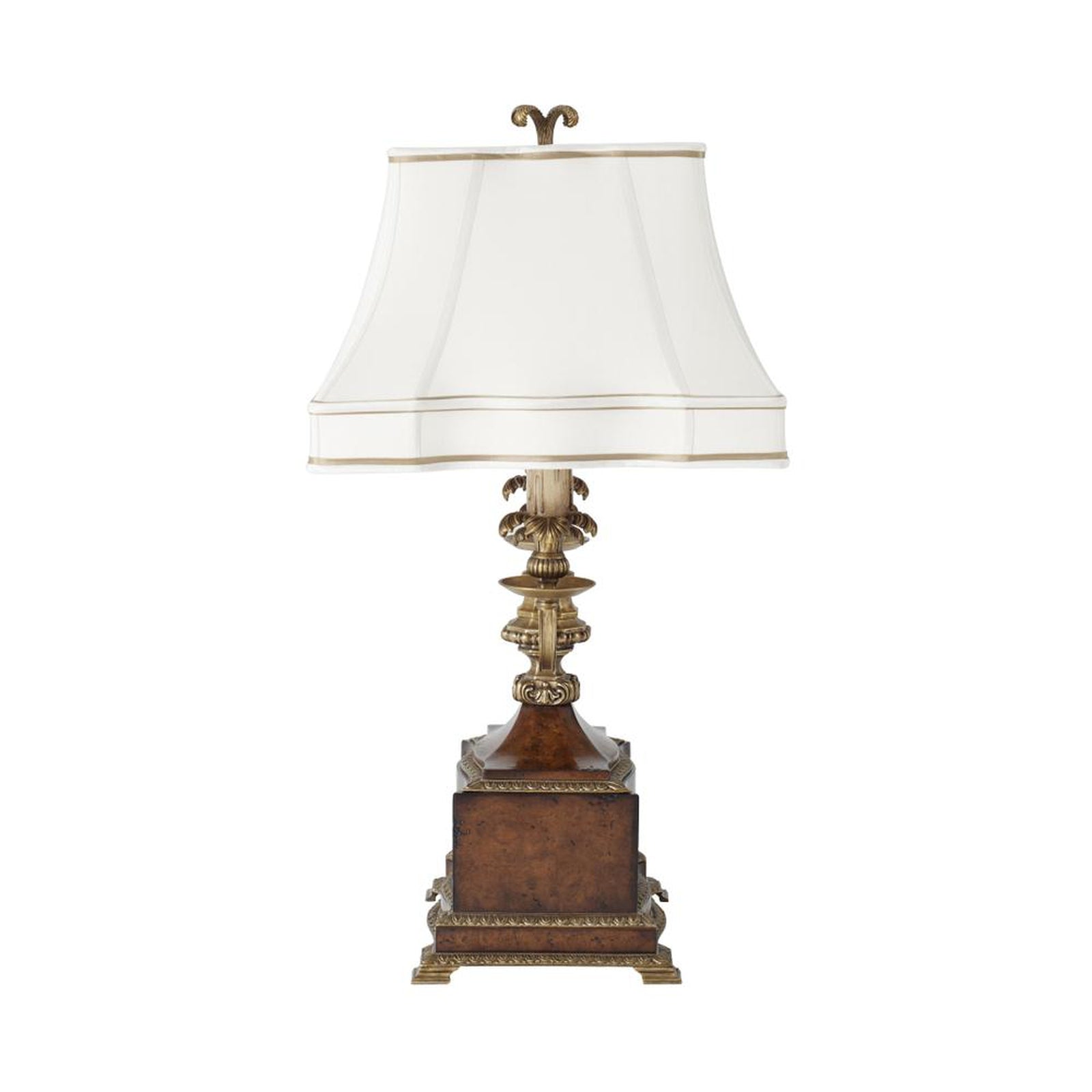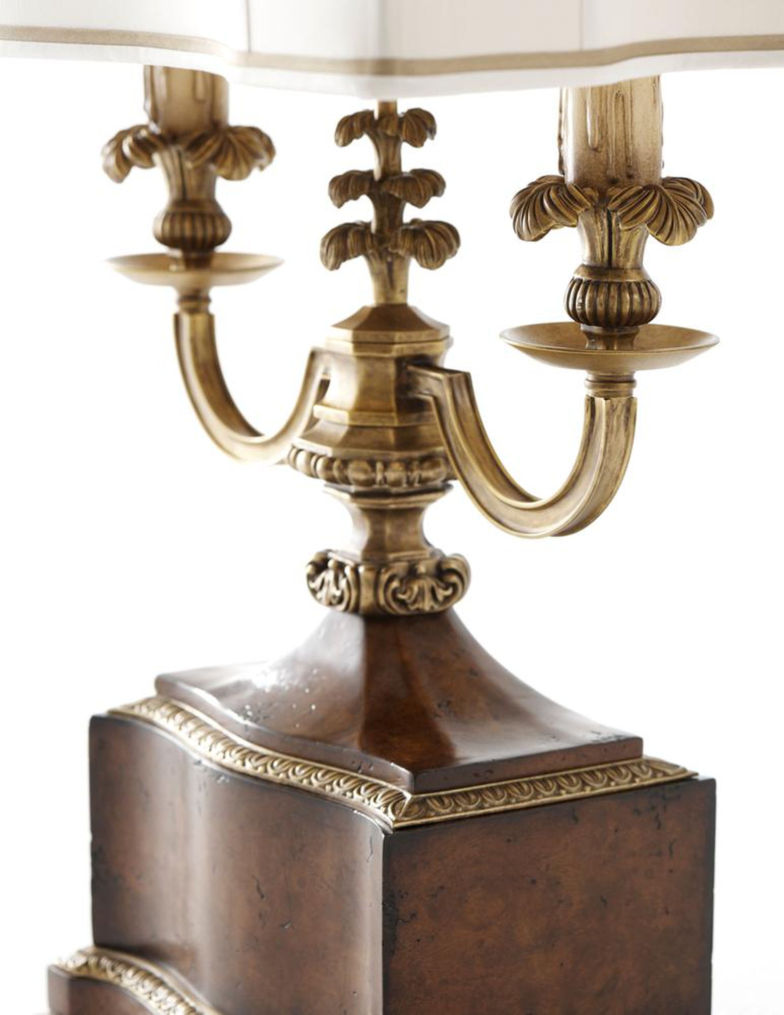 - A pollard burl and finely cast brass table lamp, the twin light arms above a shaped base with brass mounts surmounted by hand sewn silk shade.