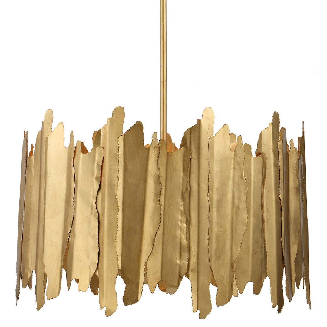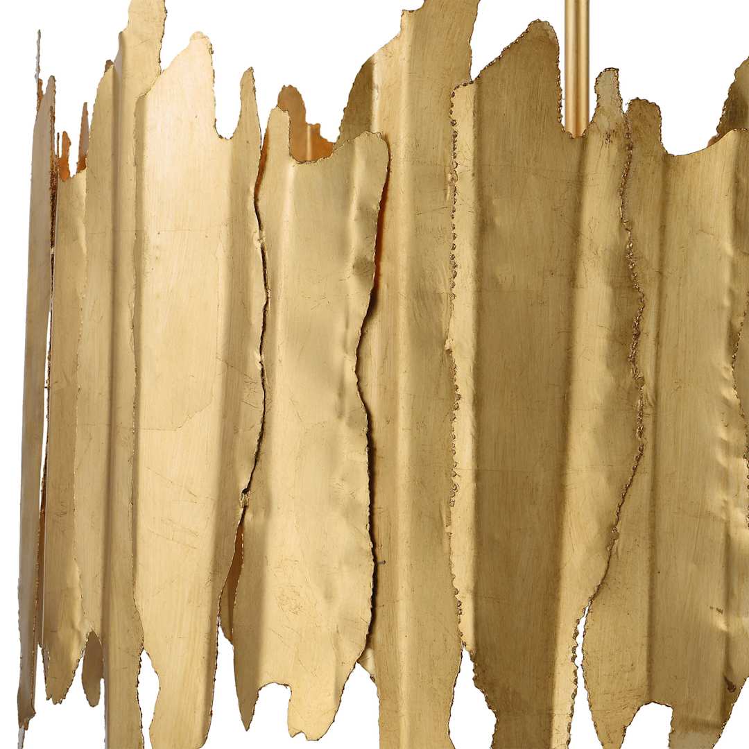 Industrial metal segment sheets welded with rough cut edges juxtaposed with a gold leaf finish give an elegant look to this chic pendant. Supplied with 15' wire, 3-12" stems and 1-6" stem for adjustable installation with 8-60 watt max candelabra sockets.