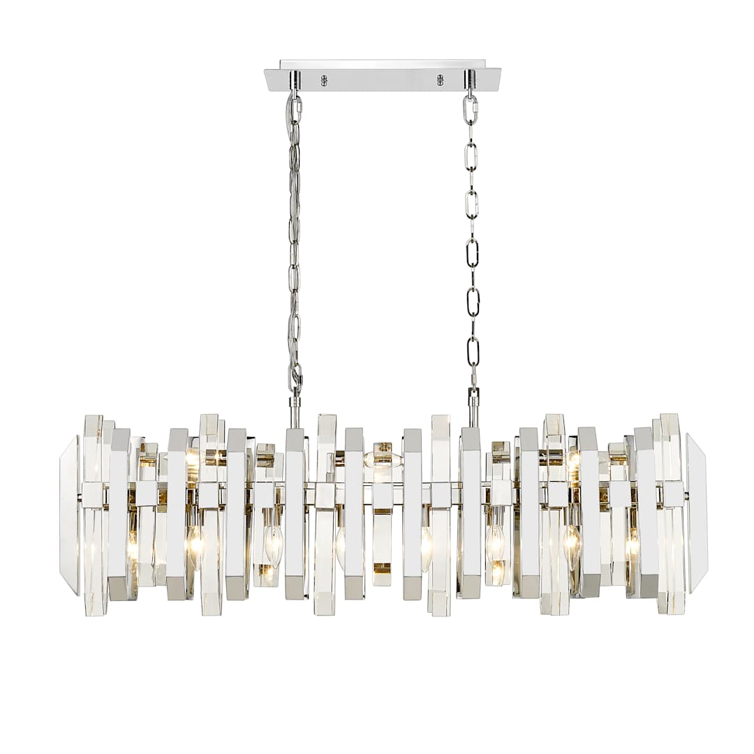Chunky, rectangular slabs of crystal towers, suspended between highly polished stainless-steel towers, formed together in contemporary sleek shapes, create a stunning collection on of crystal chandeliers and pendants.