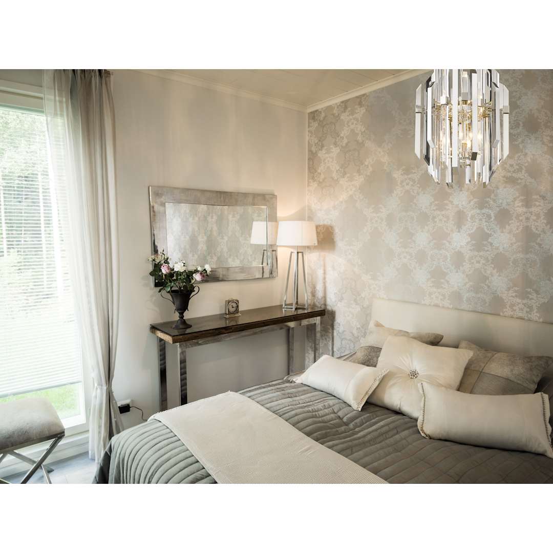 Chunky, rectangular slabs of crystal towers, suspended between highly polished stainless-steel towers, formed together in contemporary sleek shapes, create a stunning collection on of crystal chandeliers and pendants.